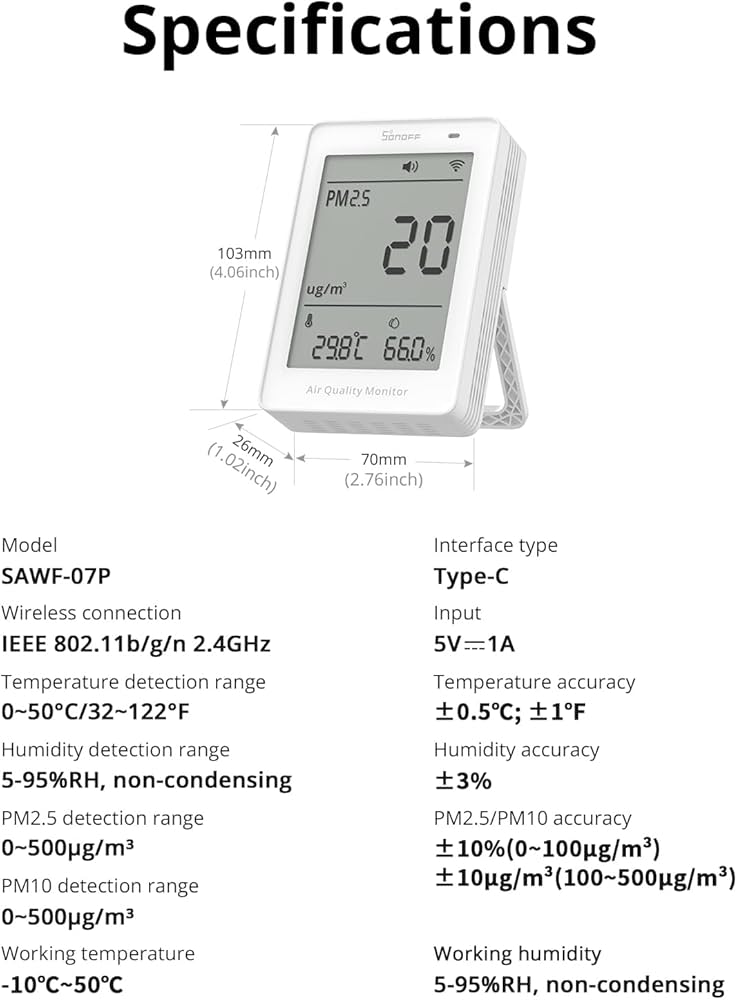 The Sonoff Air Quality Monitor PM is a compact smart device designed to monitor the air you breathe. By accurately measuring PM2.5 particulate levels, it helps you understand and improve your indoor air quality for a healthier home or workspace.